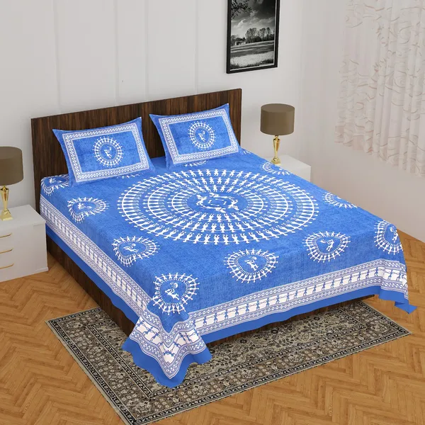 Blue Jaipuri Printed Cotton Hand Print Bedsheet With 2 Pillow Case