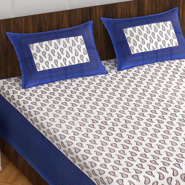 Blue Jaipuri Printed Cotton Hand Print Bedsheet With 2 Pillow Case