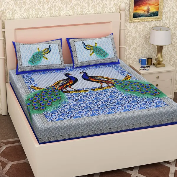 Blue Luxury Jaipuri Pure Cotton Bedsheet With Handmade Sanganeri Print And ..More