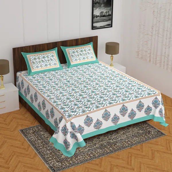 C- Green Bed Hand Block Print Cotton Bedding Bed Sheet With 2 Pillow Cover