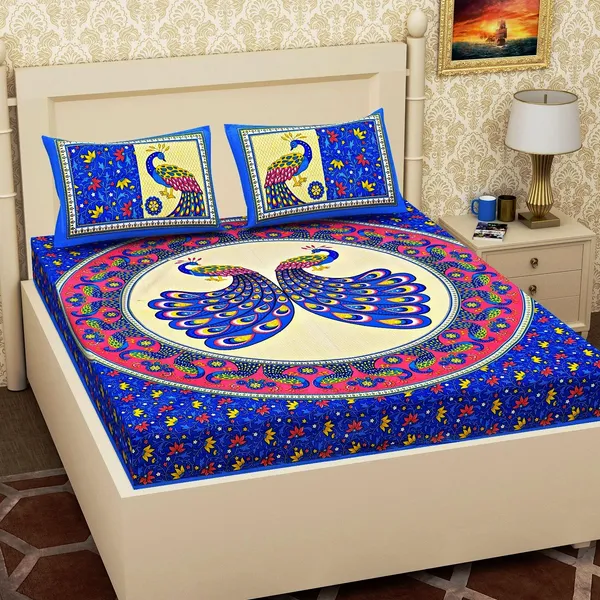 Dark Blue Printed Cotton Jaipuri King Bed Sheet Bed With 2 Pillow Covers