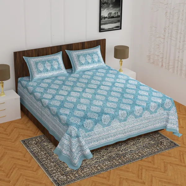 Gray New Jaipuri Pure Cotton Bedsheet With Handmade Sanganeri Print And Two..More