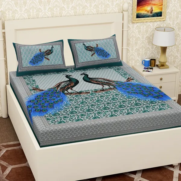 Green & Blue Luxury Jaipuri Pure Cotton Bedsheet With Handmade Sanganeri Pr..More
