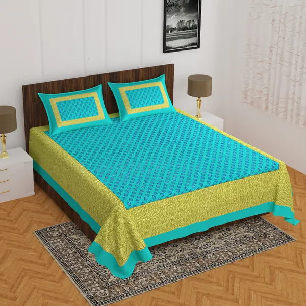 Green And Sky Blue Best Luxury Look Jaipuri Pure Cotton Bedsheet With Hand..More