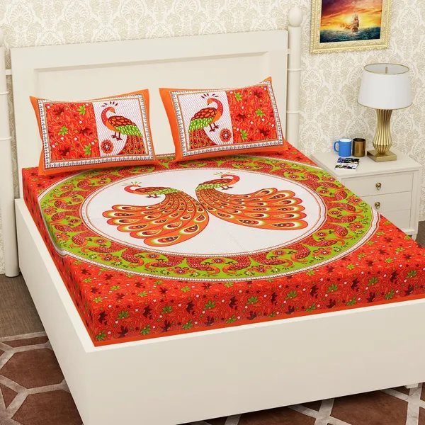 Orange Cotton Traditional Jaipuri Print 1 Bed Sheet With 2 Pillow Covers