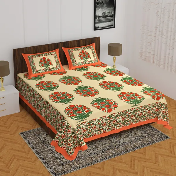 Orange Guldasta Design With Flowers Luxury Print Jaipuri Pure Cotton Bedshe..More