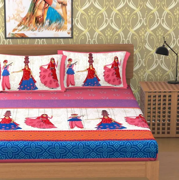 Pink Luxury Jaipuri Pure Cotton Bedsheet With Handmade Sanganeri Print And ..More