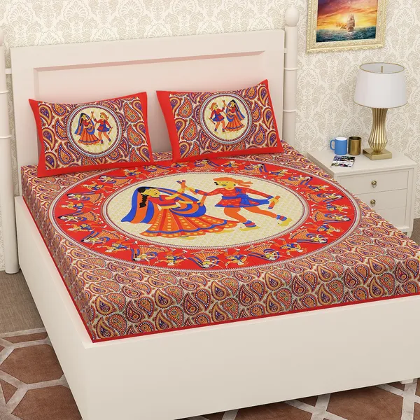 Red Luxury Jaipuri Pure Cotton Bedsheet With Handmade Sanganeri Print And T..More