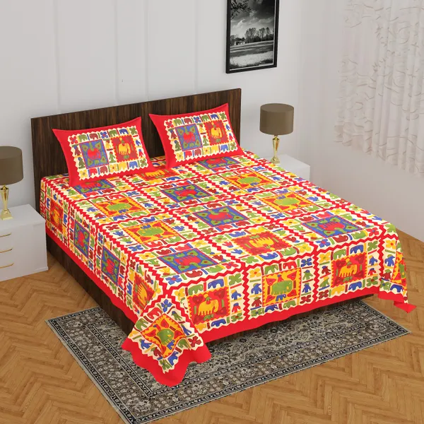Red Traditional Jaipuri Print 1 Bed Sheet With 2 Pillow Covers (100% Cotton..More