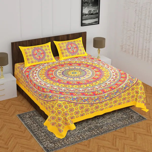 Yellow Cotton Traditional Jaipuri Print 1 Bed Sheet With 2 Pillow Covers