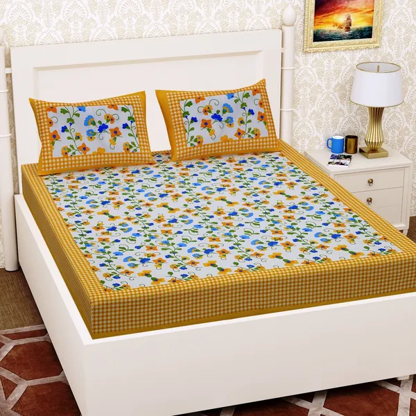 Yellow Printed Cotton Jaipuri King Bed Sheet Bed With 2 Pillow Covers